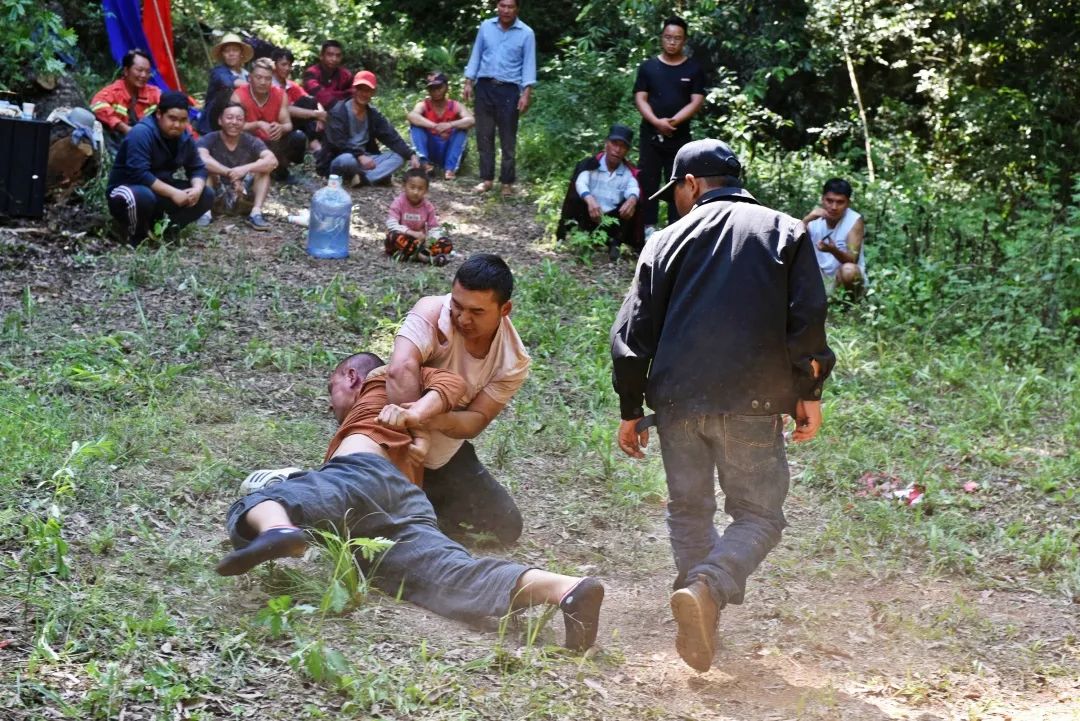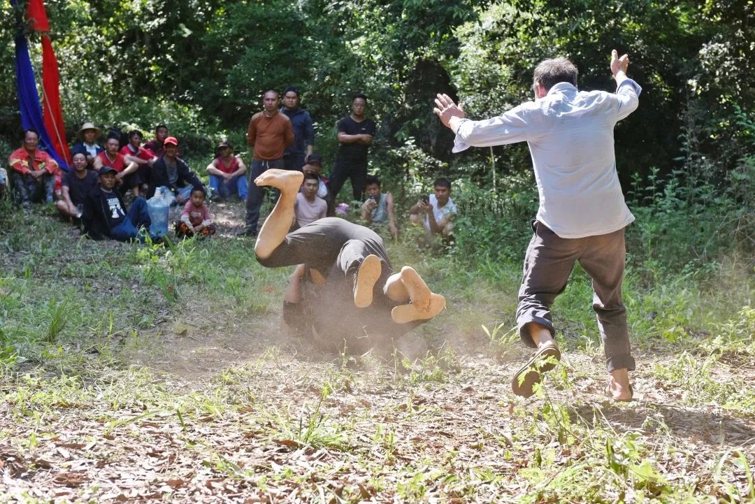 祭祀的这天,还会在祭祀广场进行摔跤比赛,斗智斗勇。彝族摔跤的历史相当久远,在激烈的生存环境中,在与自然界进行斗争中,为求得生存,利用自己的力量、技巧取得食物和保卫家园而形成的。随着时间的演变,摔跤成了彝族阿细人节日里的一项比赛项目,形式别具特色。