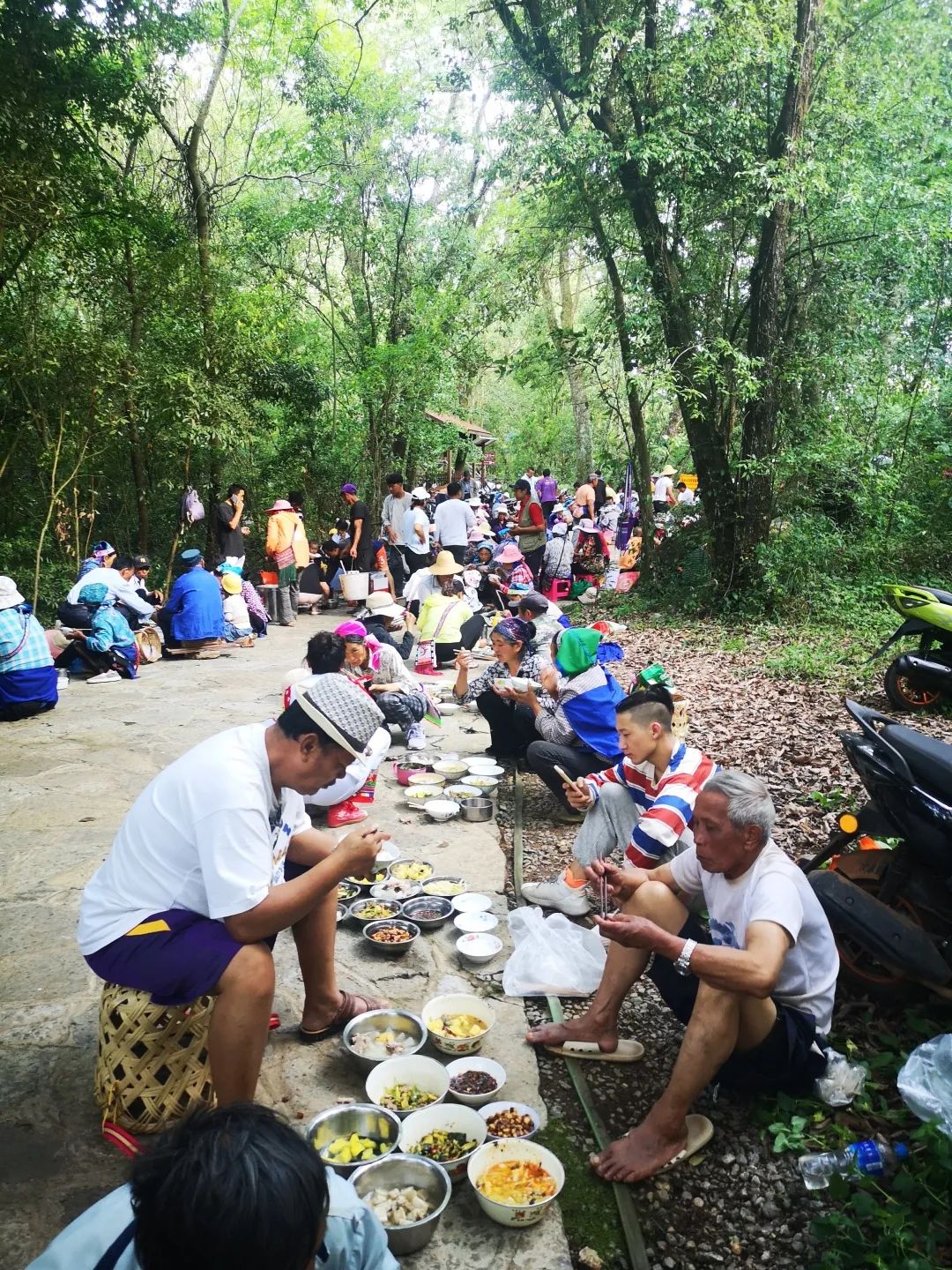 在整个祭祀过程中,女子是不允许参与的。直到祭祀完了,男子们才开始忙碌起来,准备晚上的菜肴,到了傍晚,全村的人都到密枝林参与节日,在密枝用餐,回去的时候把敬过密枝神的猪肉,分给每家每户,村民可带回去给家里人共享。