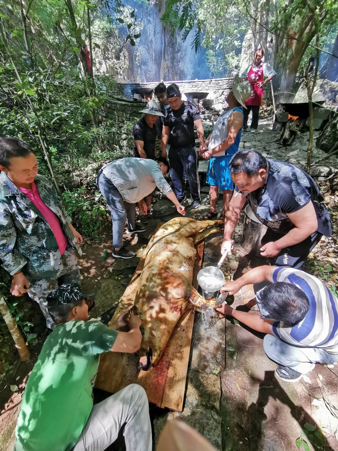 在密枝林外,其他的村中男子也开始陆续赶到,搬食材,搭灶,抬黑猪,忙的不亦乐乎,每个进密枝林男人,用清香叶树枝“净身”,跨过燃着清香树叶的火盆,寓意去除污秽、趋吉避凶。