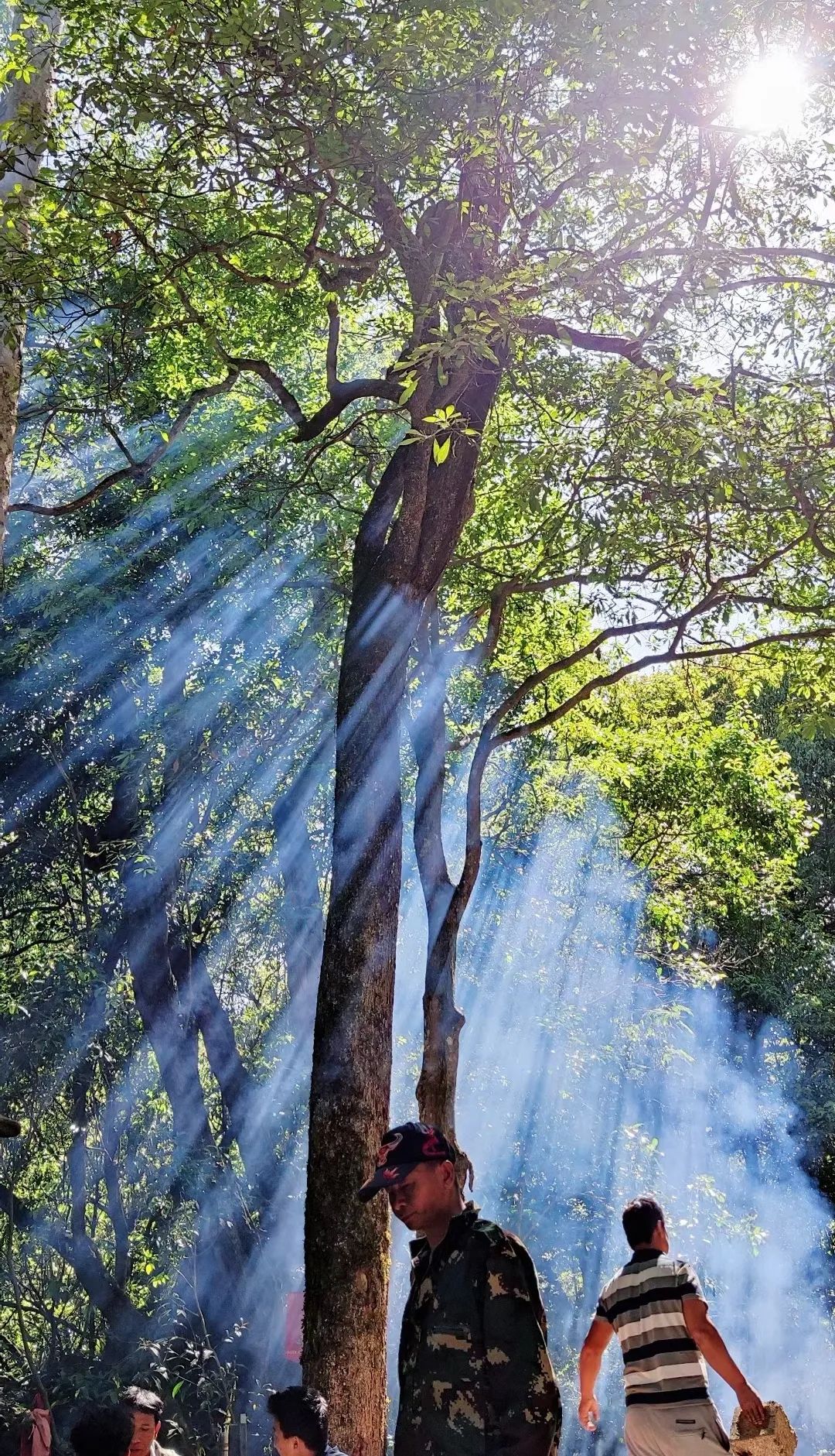 彝族村寨的神圣之林——密枝林。阿细人认为此山中有神灵居住,是不可冒犯的圣境,村民除祭祀以外不可随意进入,更不能随意破坏森林中的一草一木,由于山林之中树木繁密,空气醇净,清凉湿润,下过雨后的密枝神山,烟雾弥漫,远远望去,犹如仙境。